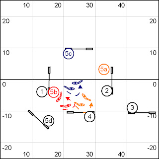 For 5b, the front cross should be done between 3 and 4, at the far wing of #4. When you finish your rotation, you should be driving towards 5b. If you chose to cross between 4 and 5b, you would be crossing on a straight line, not at the turn.