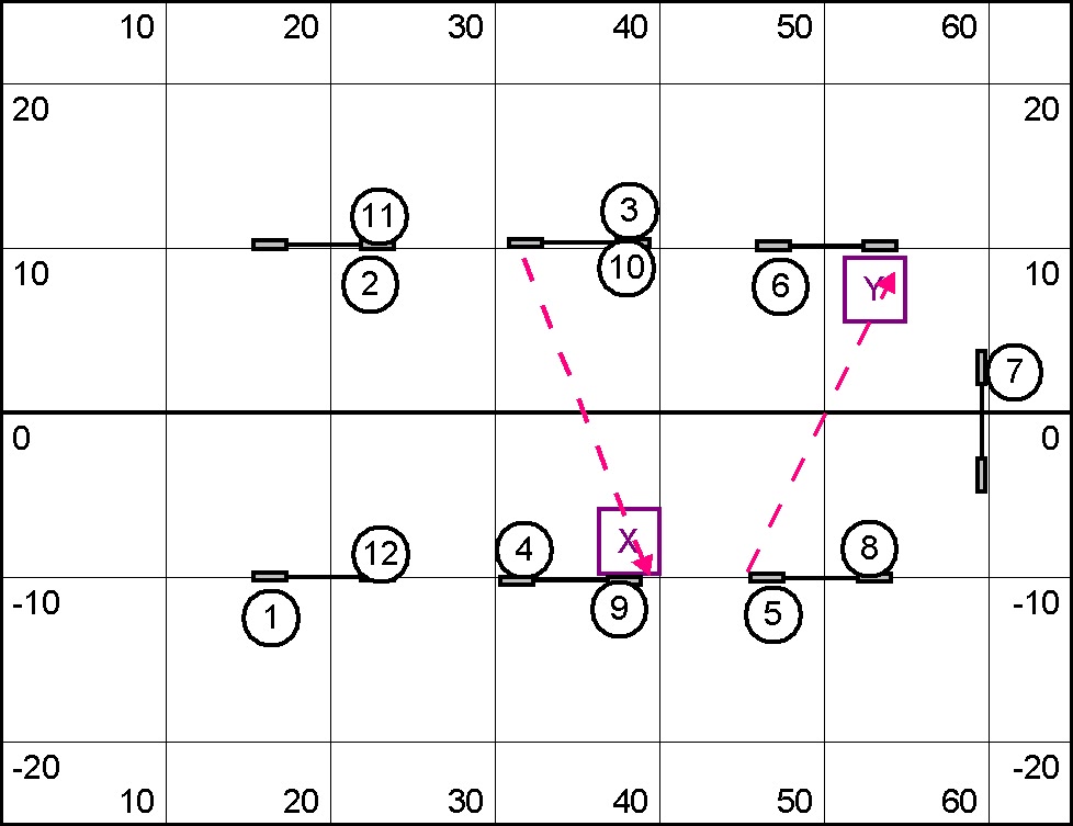 One aspect of Greg’s system is the positional cue. Basically, this means that when executing a front cross, it should be done when the dog makes a turn, and when doing that cross, you should finish it at the far wing of the next jump the dog is taking. You do not start your rotation for the front cross until your dog starts to take off for the jump–anything else is early. Your position at that jump is a cue to the dog that THAT is where they are going next. Greg has a nice illustration of the different places for front crosses, and why when done in the incorrect position, they can all look the same, and ultimately end up creating a slower, more uncertain dog, vs. a dog that knows exactly where it’s going. I’m not good with Clean Run Course Designer, but I will do my best to illustrate.
